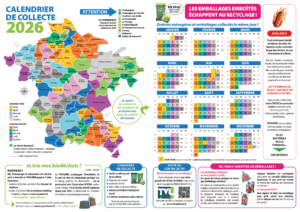 Le calendrier de collecte 2026 est remis gratuitement par les mairies.